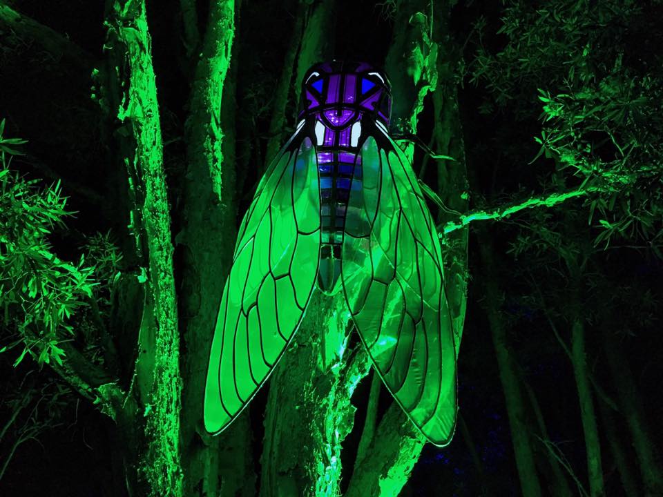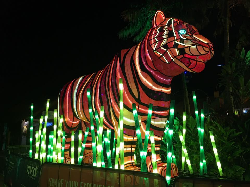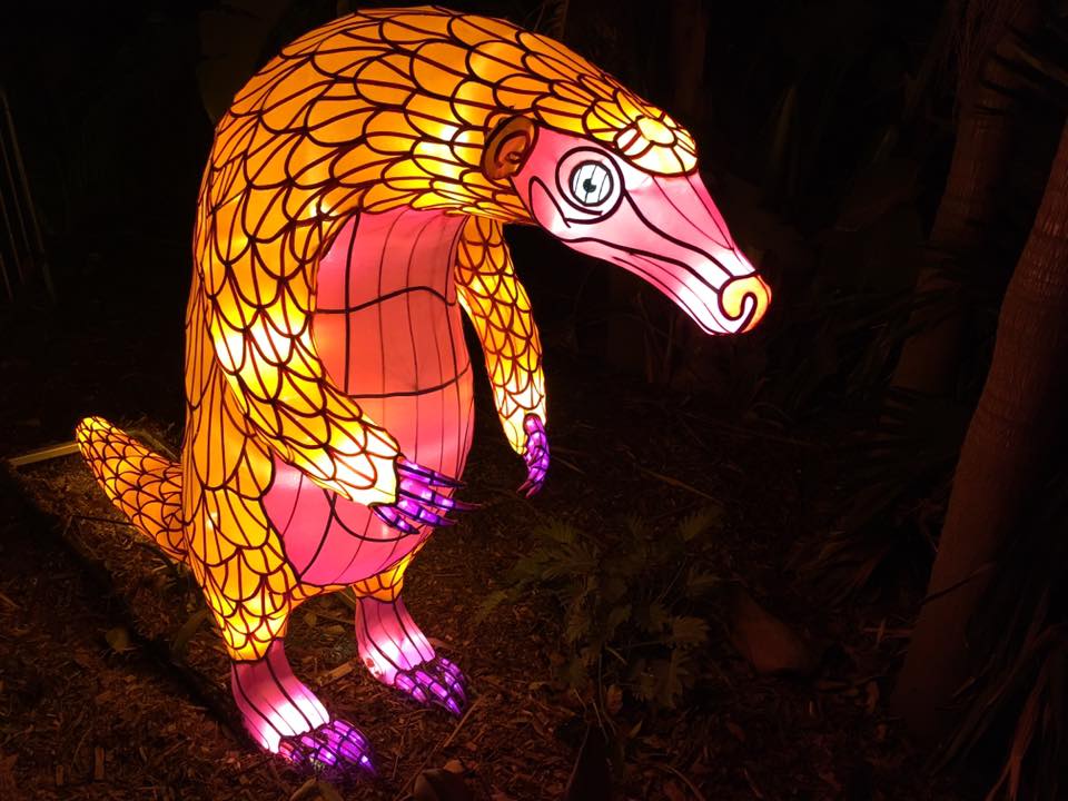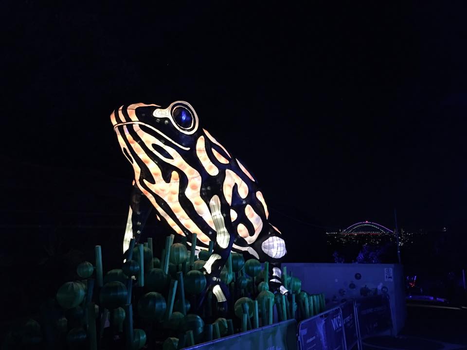 The Vivid Sydney at Taronga Zoo trail weaves you through the zoo leading you to ten giant animal multimedia light sculptures which represent ten critical species from Australia and Sumatra that Taronga is committed to protecting. These are the: marine turtle, Sumatran rhino, greater bilby, sun bear, pangolin, regent honeyeaters, corroboree Frog, Sumatran tiger, asian elephant, and the platypus. Throughout the trail you will also spot smaller sculptures such as monkeys and cicadas. If you’re kids helped make a sculpture at school, you’ll also discover that there are around 1600 displayed around the zoo. I was so proud to see what had been created by our kids!